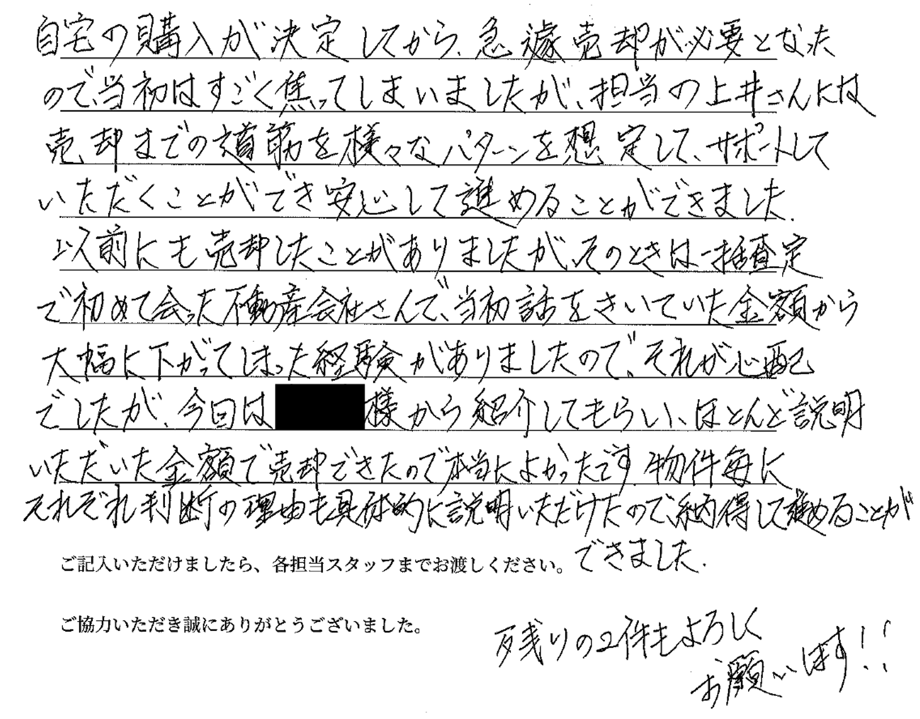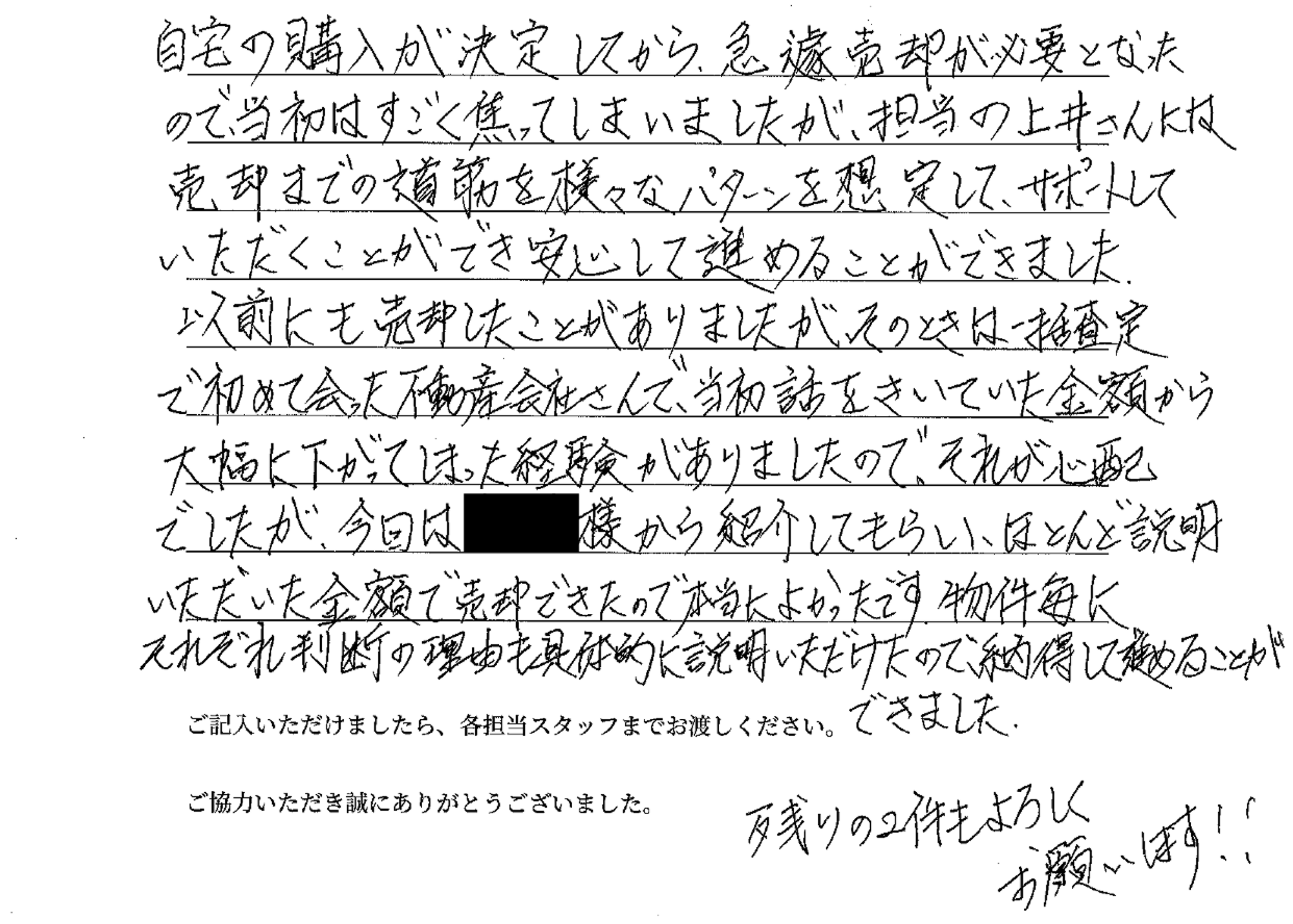 以前にも売却したことがありましたが、そのときは一括査定で初めて会った不動産会社さんで、当初話をきいていた金額から大幅に下がってしまった経験がありましたので、それが心配でしたが、今回は○○様から紹介してもらい、ほとんど説明いただいた金額で売却できたので本当によかったです。物件毎にそれぞれ判断の理由も具体的に説明いただけたので納得して頼ることができました。