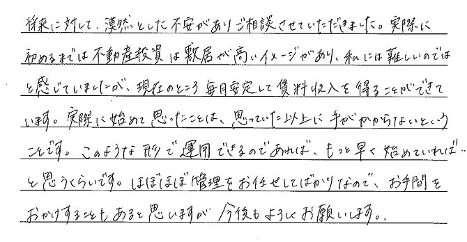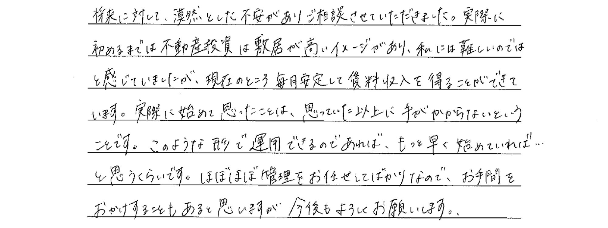 将来に対して、漠然とした不安があり相談させていただきました。実際に初めるまでは不動産投資は敷居が高いイメージがあり、私には難しいのではと感じていましたが、現在のところ毎月安定して賃料収入を得ることができています。実際に始めて思ったことは、思っていた以上に手がかからないということです。このような形で運用できるのであれば、もっと早く始めていれば…と思うぐらいです。ほぼほぼ管理をお任せしてばかりなので、お手間をおかけすることもあると思いますが、今後もよろしくお願いします。